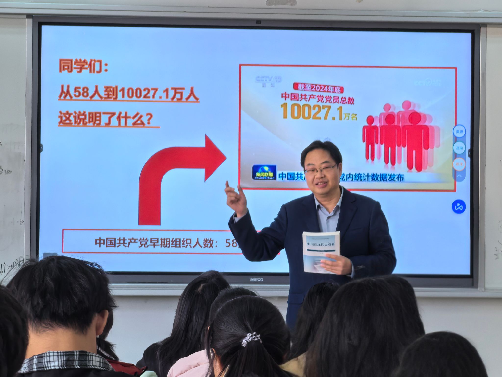 最后,袁雄针对历史课程的学习方法,讲解“把厚书读薄、把薄书读厚”的治学智慧。他指出,“把厚书读薄”,就是从纷繁历史事件中提炼核心规律和价值,牢牢把握“中国共产党始终与人民站在一起”的主题主线,融入自己的世界观、人生观、价值观,转化为成长成才的内生动力。“把薄书读厚”,则是将书本中学到的真理指导实践,再从实践中去总结规律,提升自己的水平,丰厚自己的学识。袁雄强调,“这本《中国近现代史纲要》的厚度藏在史料里,而力量藏在精神里,要让历史智慧成为一辈子的前进动力。”