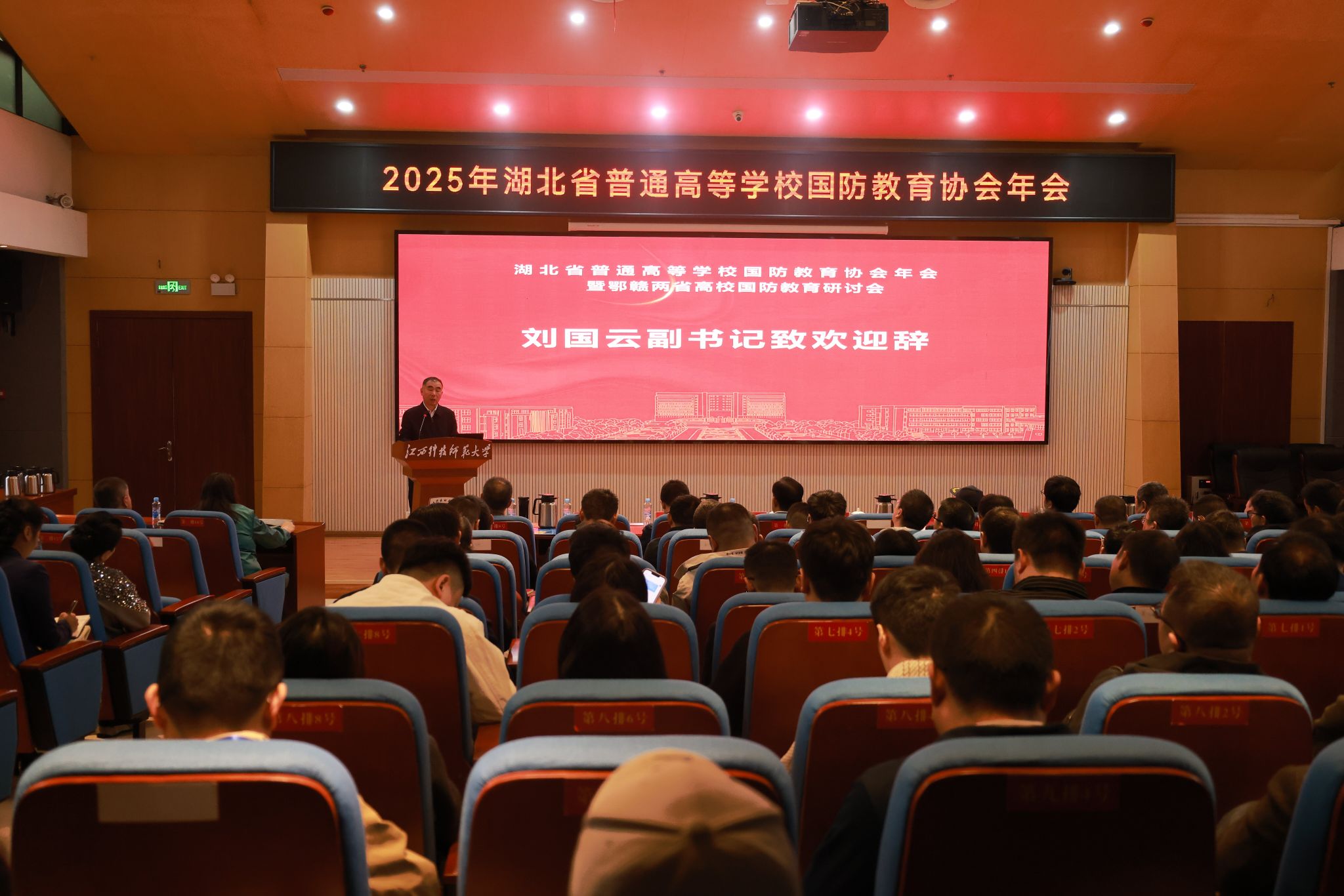 202511月11日,2025年湖北省普通高等学校国防教育协会年会暨鄂赣两省学校国防教育研讨会在我校红角洲校区图书馆学术报告厅举行。江汉大学学工部、人民武装部副部长王德顺主持会议。来自湖北、江西两省多所高校的国防教育负责人、专家学者齐聚一堂,围绕新时代高校国防教育的使命与挑战展开深入交流。我校党委副书记刘国云教授致欢迎辞。他对远道而来的鄂赣两省教育同仁表示欢迎,并深情回顾了两省共同的历史渊源与红色传承。他指出,湖北高校在国防教育方面走在全国前列,...