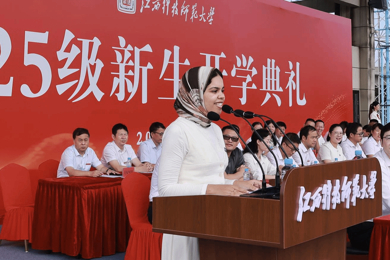 留学生新生代表、国际教育学院国际中文教育专业摩洛哥籍学生艾莎分享了自己与中国的渊源,表示将认真学习更多中国文化知识,做中国文化的忠实爱好者和传播者。