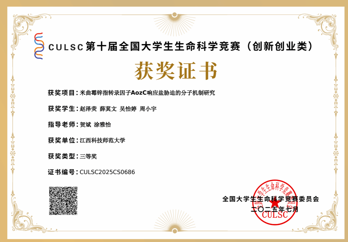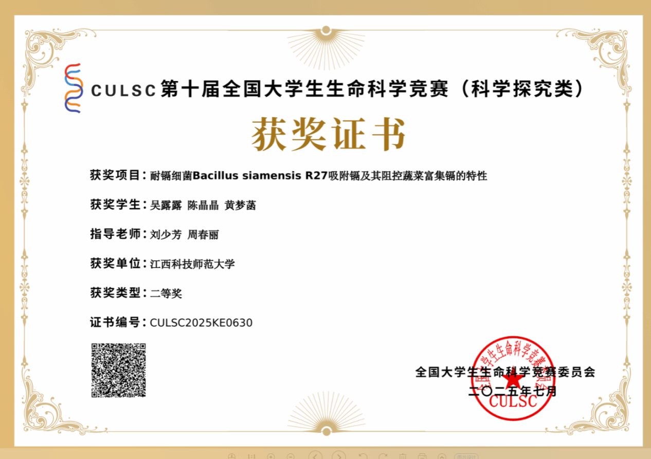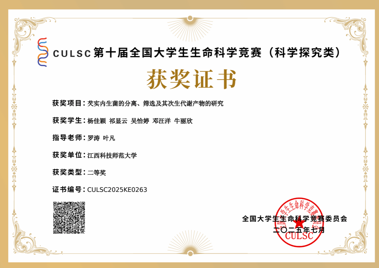 作为生命科学领域最具影响力的国家级学科竞赛之一,本届赛事规模盛大、竞争激烈。我校参赛团队历经数月的精心备赛,最终在“科学探究类”赛道,获得国家级二等奖2项,国家级三等奖1项,省级一等奖2项,省级二等奖1项,省级三等奖8项。其中,获得国家级二等奖的项目《芡实内生菌的分离、筛选及其次生代谢产物的研究》(指导教师:罗涛)和《耐镉细菌Bacillus siamensis R27吸附镉及其阻控蔬菜富集镉的特性》(指导教师:刘少芳),项目研究设计严谨、数据翔实、结论创新,得到了评审专家的一致高度评价,彰显了我校在基础前沿科学研究方面的实力。在“创新创业类”赛道,同学们将科研成果与产业需求紧密结合,荣获国家级三等奖2项。