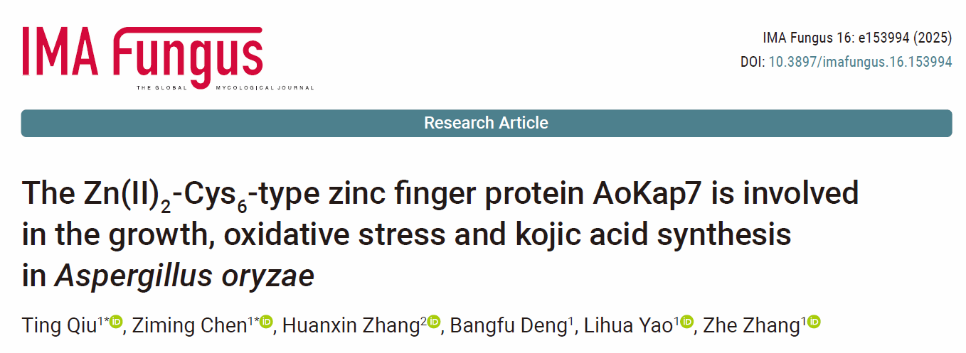 近日,我校生命科学学院、天然微生物药物研究江西省重点实验室张哲团队在中国科学院一区国际真菌学协会旗舰期刊《IMA Fungus》上发表题为“The Zn(II)2-Cys6-type zinc finger protein AoKap7 is involved in the growth, oxidative stress and kojic acid synthesis in Aspergillus oryzae”的研究性论文。该项目得到国家自然科学基金(32460020,32560212,32000049)、江西省自然科学基金重点项目(20242BAB26088,20252BAC250105)和面上项目(20232BAB205001)的支持。
