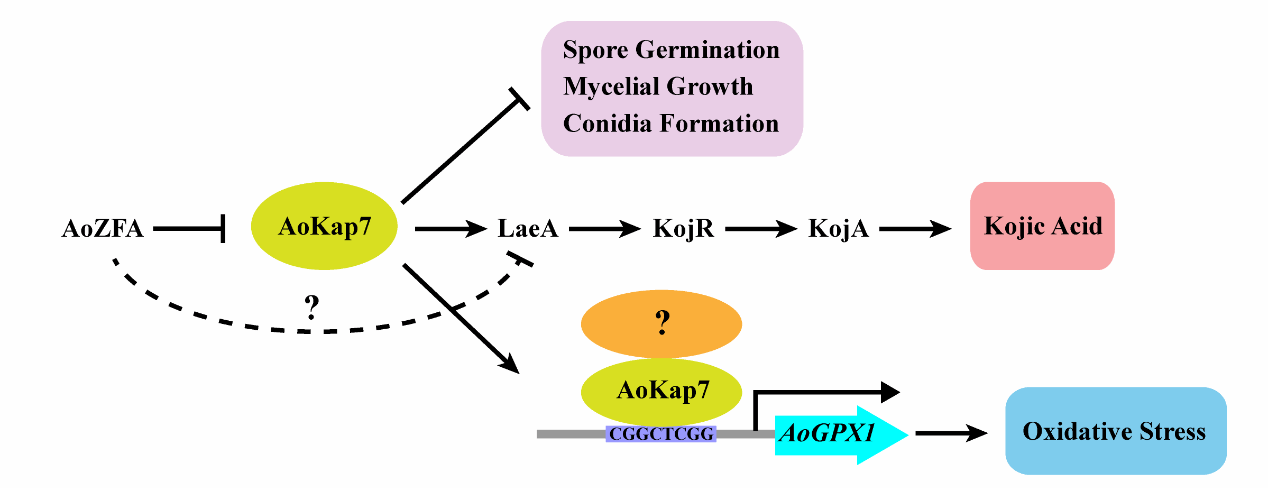 米曲霉是一种在工业生产中具有重要价值的丝状真菌,它能生产应用广泛的次级代谢产物——曲酸。尽管2010年已鉴定出米曲霉曲酸合成基因簇,但其邻近基因的功能以及曲酸合成调控通路仍不清楚。我校研究团队通过CRISPR/Cas9技术构建Aokap7敲除菌株,利用形态学分析、基因表达分析、亚细胞定位、转录活性检测、酵母单杂交和电泳迁移率实验(EMSA)等手段,系统解析了AoKap7在米曲霉生长、氧化应激响应及曲酸合成中的分子调控机制。