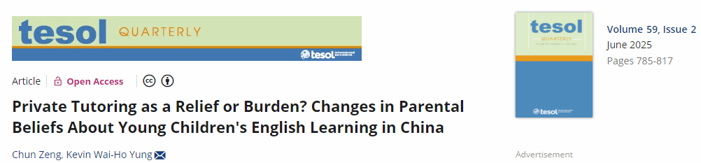 近日,外国语学院曾纯博士(第一作者)联合香港教育大学容煒灝博士(通讯作者)在语言学领域一区顶尖期刊《TESOL Quarterly》(Q1,中国科学院1区,IF:3.9)发表题为 “Private Tutoring as a Relief or Burden? Changes in Parental Beliefs About Young Children’s English Learning in China”的研究论文。