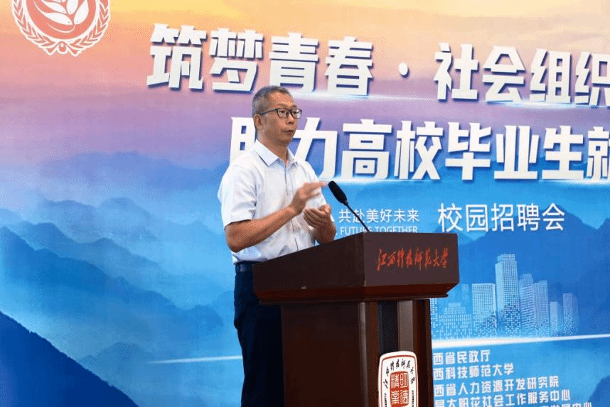 10月12日上午,由江西省民政厅主办、我校协办的 “筑梦青春・社会组织助力高校毕业生就业”校园招聘会在我校红角洲体育馆举行。省民政厅二级巡视员王永,省民政厅社会组织管理局局长罗铁军、一级调研员张海龙、三级调研员(党委办副主任)李伟、四级调研员叶兴,江西省社会组织服务和民政涉外事务中心邓清华,我校党委书记裴鸿卫,副校长郑鹏武、刘刚出席启动仪式。