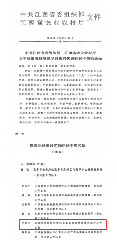 近日,省委组织部、省农业农村厅联合下文表彰乡村振兴优秀驻村干部。我校申昌元同志因在乡村振兴工作中表现突出,被授予2025年度省级乡村振兴优秀驻村干部称号。