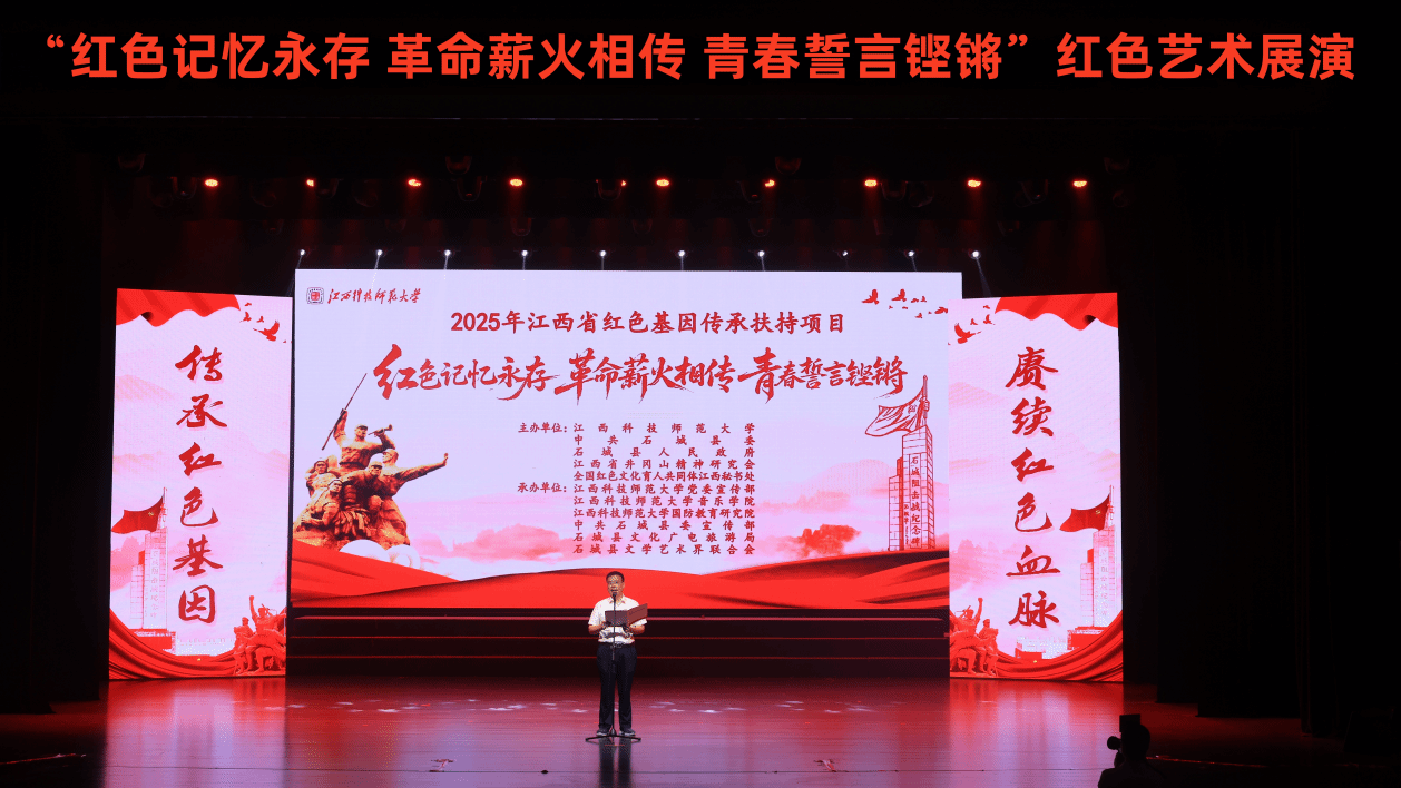 10月19日上午,2025年江西省红色基因传承扶持项目——“红色记忆永存 革命薪火相传 青春誓言铿锵”红色艺术展演在石城县文化艺术中心举行。我校党委委员、副校长李玉保,中共石城县委常委、宣传部部长钟慧敏,县委常委、组织部部长邓小兰,县委常委、政法委书记黄勇鹏,县人民政府副县长刘衍志,县政协副主席赖继红、赖晓琳等领导嘉宾出席活动,与现场观众共同感受红色艺术的魅力,聆听革命精神的回响。