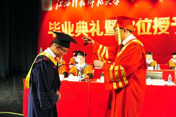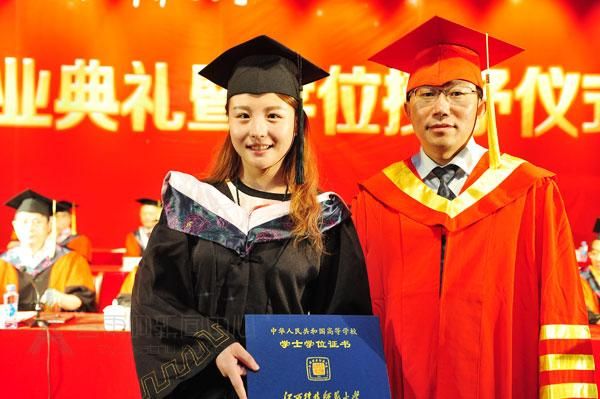 在欢快的《迎宾曲》中,校长左和平为硕士毕业生代表和本科毕业生代表授予学位并扶正流苏。
