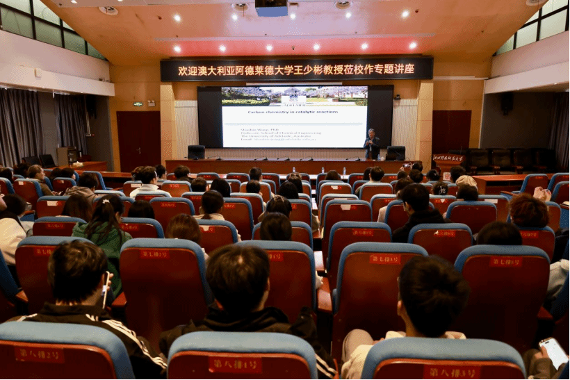 交流期间,王少彬教授介绍了阿德莱德大学的发展历程、学科特色与研究实力,并以“碳催化在能源与环境应用中的前沿进展”为题作学术报告。报告系统阐述了纳米碳材料的创新制备策略及其在能源转化与环境污染治理领域的应用潜力,重点剖析了通过调控碳材料的分子构型、结构缺陷与表面官能团,以揭示其活性位点与催化机理的最新研究成果,特别强调了碳缺陷的类型与数量对提升催化性能的关键作用。