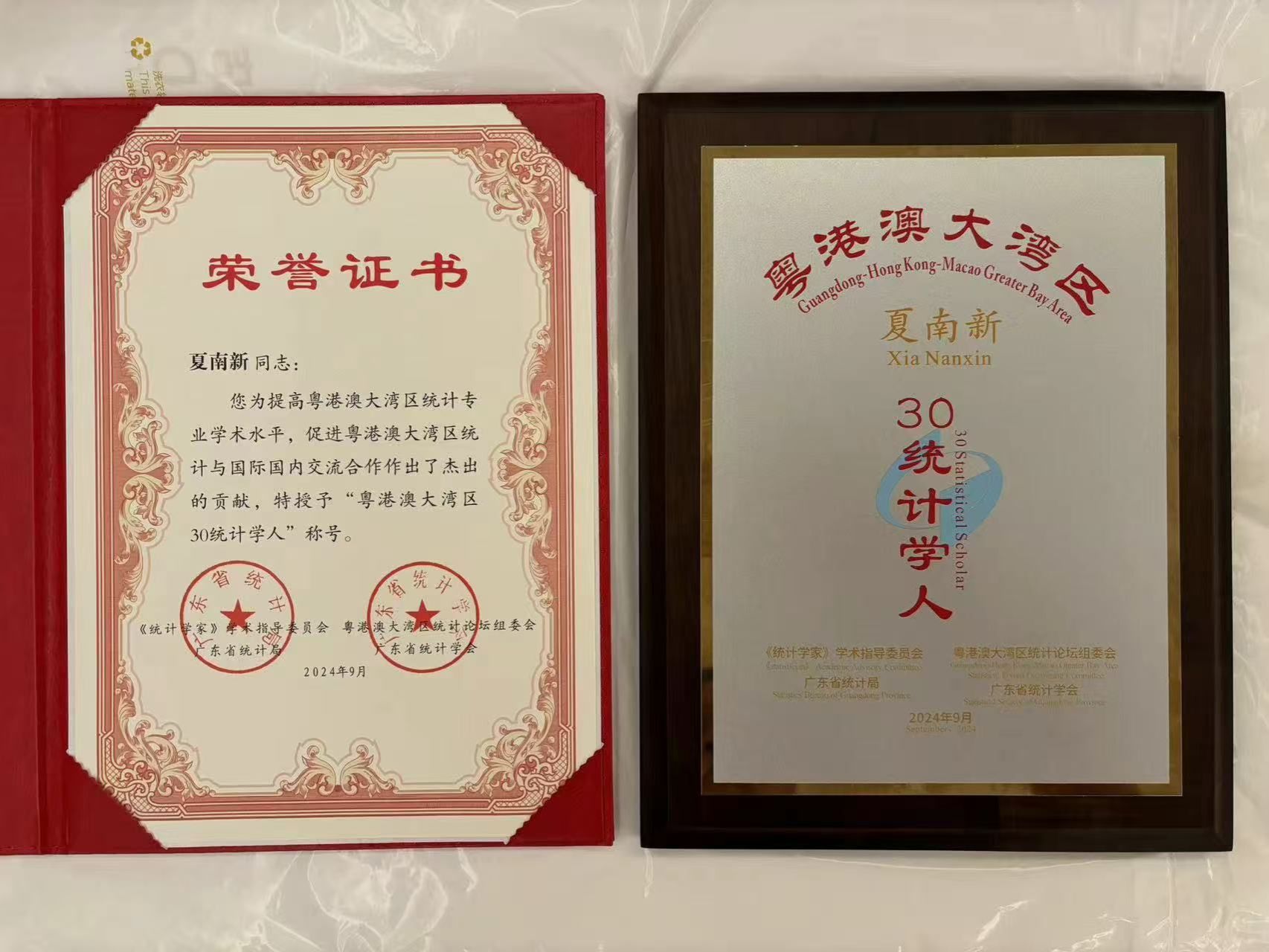图2 2024年9月夏南新教授被广东省统计局授予“粤港澳大湾区30统计学人”