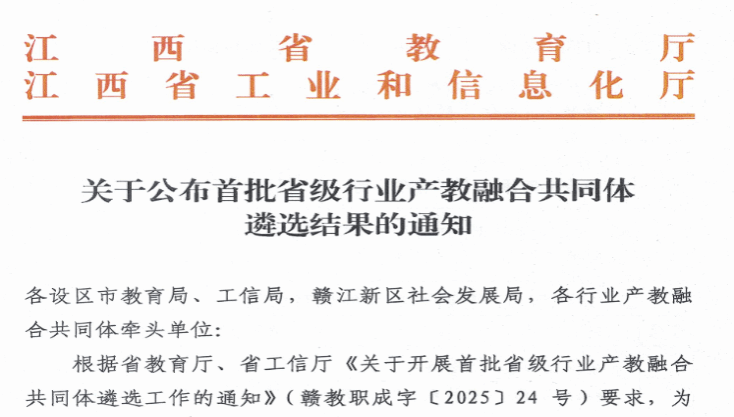 近日,江西省教育厅、江西省工业和信息化厅联合公布首批省级行业产教融合共同体遴选结果,全省仅有5个省级行业产教融合共同体及2个培育单位。我校牵头的智能硬件行业产教融合共同体和现代文旅行业产教融合共同体成功入选,这是我校在深化产教融合、推进校企协同育人方面取得的又一重要成果。