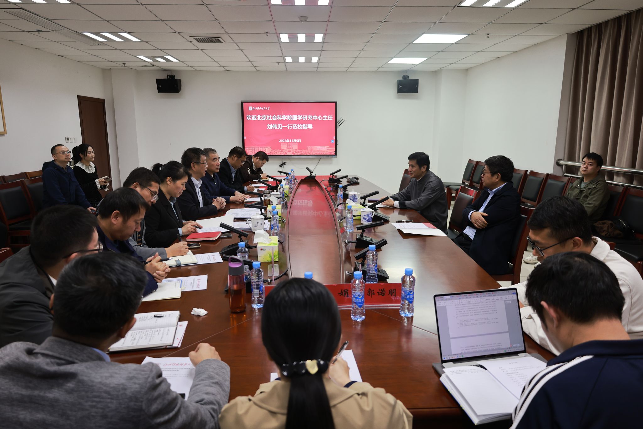 11月5日下午,北京社会科学院国学研究中心主任刘伟见与广州摩翼信息科技有限公司创始人、董事长康鑫来校调研座谈,校党委书记裴鸿卫、党委副书记刘国云、副校长刘刚、党委宣传部部长余玉荣出席。