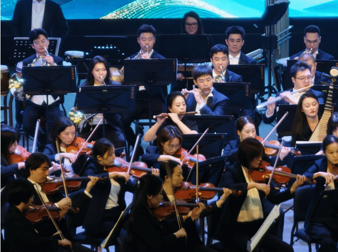 音乐会分上半场与下半场。上半场《灯火里的中国》旋律优美、歌词细腻,描绘出灯火漫卷的万里山河。《梁祝》深情婉转、《寸心》大气恢弘、《火车托卡塔》激情澎湃,民乐合奏《金蛇狂舞》将现场气氛推向高潮。