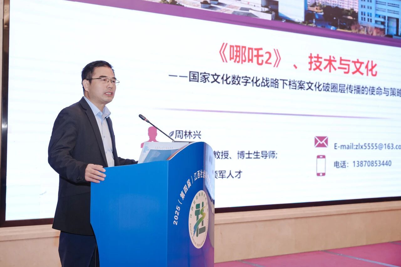 周林兴教授以“《哪吒2》、技术与文化——国家文化数字化战略下档案文化破圈层传播的使命与策略”为题,提出档案文化破圈层传播的实践策略在于紧跟时事政策引航,把牢档案文化传播发展方向;重塑文化叙事策略,深化档案文化传播价值共鸣;深耕文化数据挖掘,打造档案文化传播创意生态。