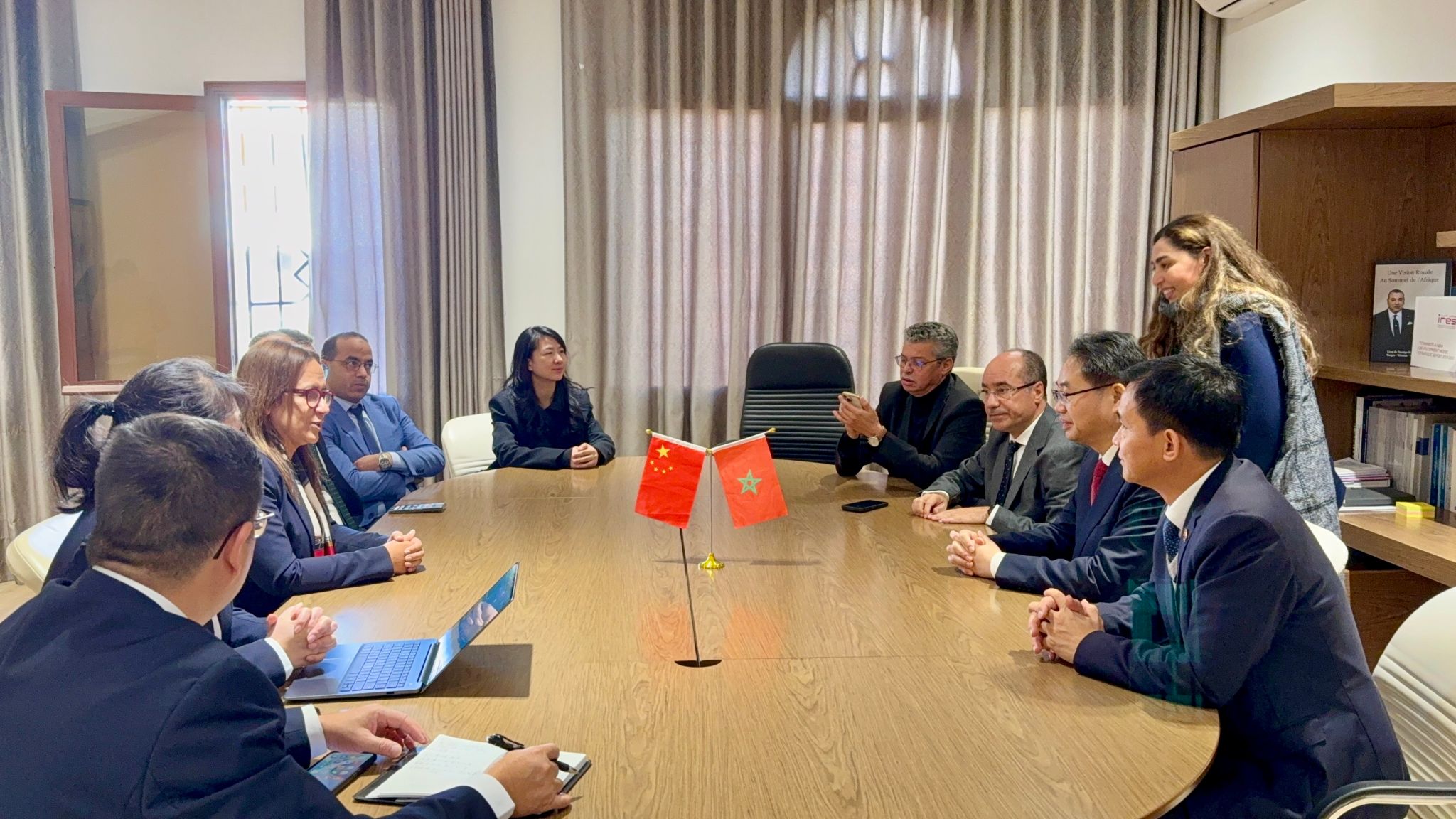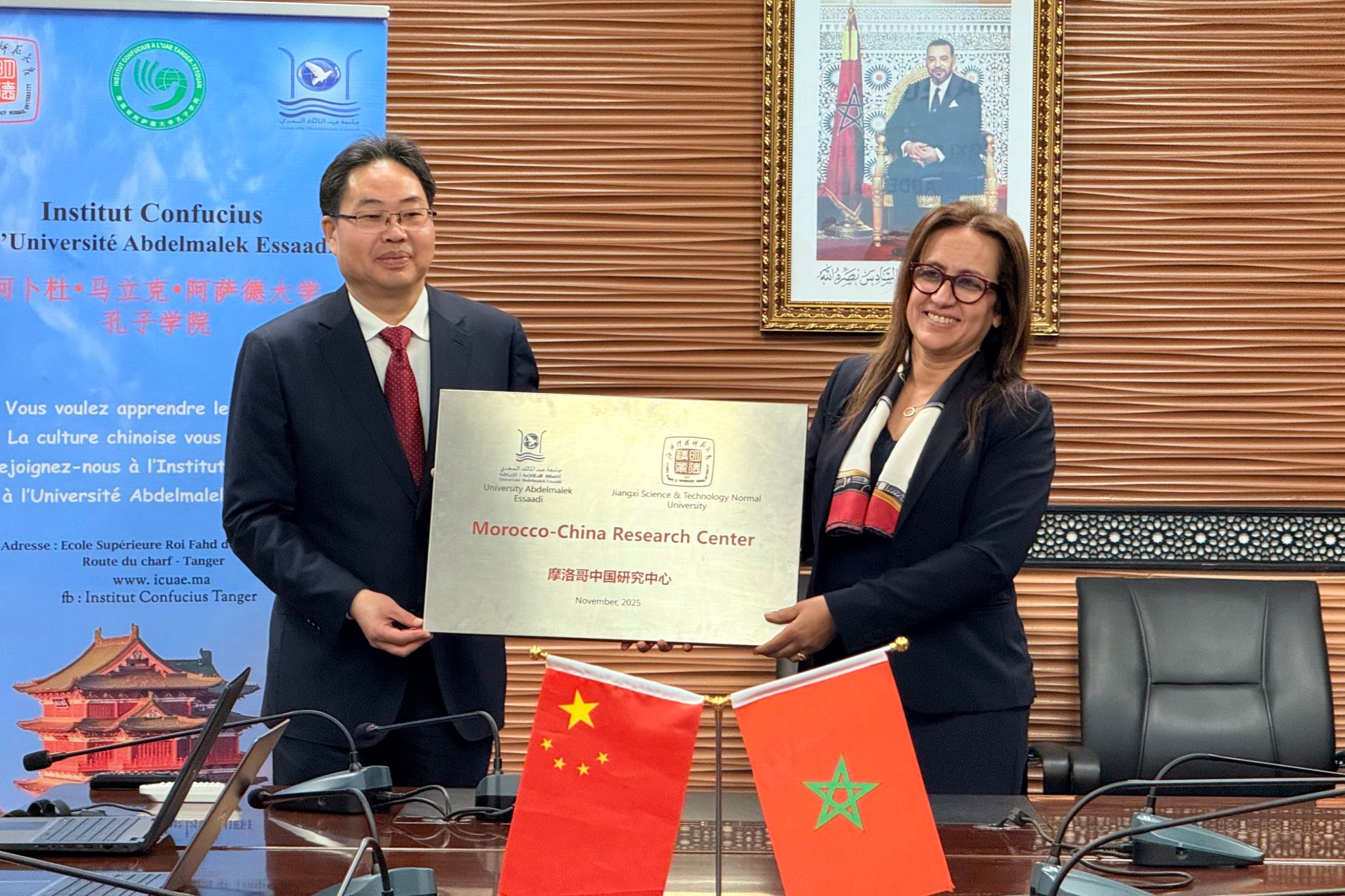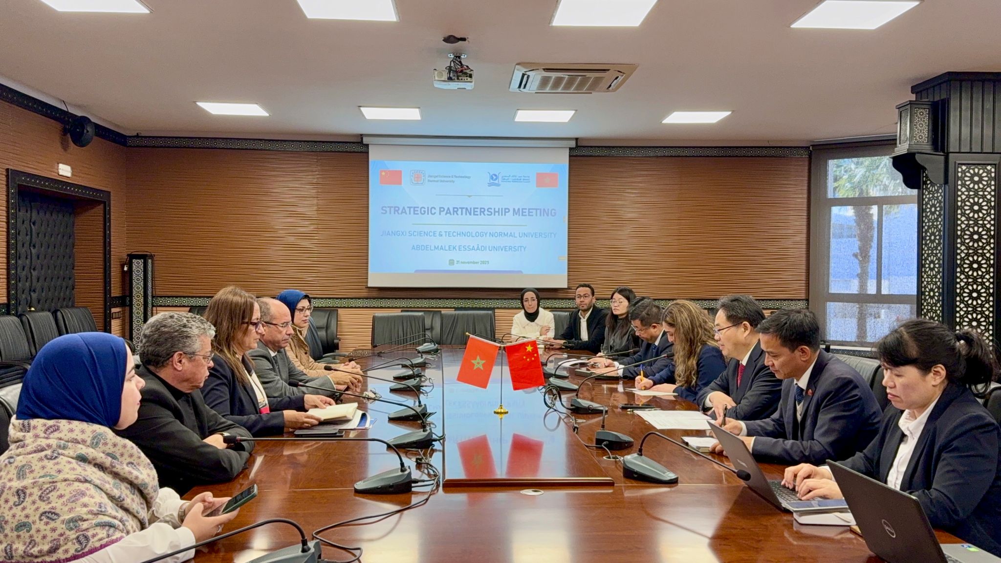 是日13:00,双方在阿卜杜·马立克·阿萨德大学丹吉尔商业与管理学院(ENCGT)举行校际合作会谈。摩方参会人员包括阿卜杜·马立克·阿萨德大学副校长CHERKAOUI DEKKAKI HIND女士、ENCGT院长MAGHNI AHMED先生以及孔子学院外方院长哈立德等;中方由江西科技师范大学出访团及丹吉尔孔子学院团队共同出席。会谈围绕双边合作的重点议题展开,双方就中文翻译硕士项目建设(含课程体系构建、师资支持与交换生互访机制)、药草研究和商务中文等跨学科合作进行了深入研讨,并就江西科技师范大学拟设立的硕士赴华冬令营专项资助计划达成一致。
