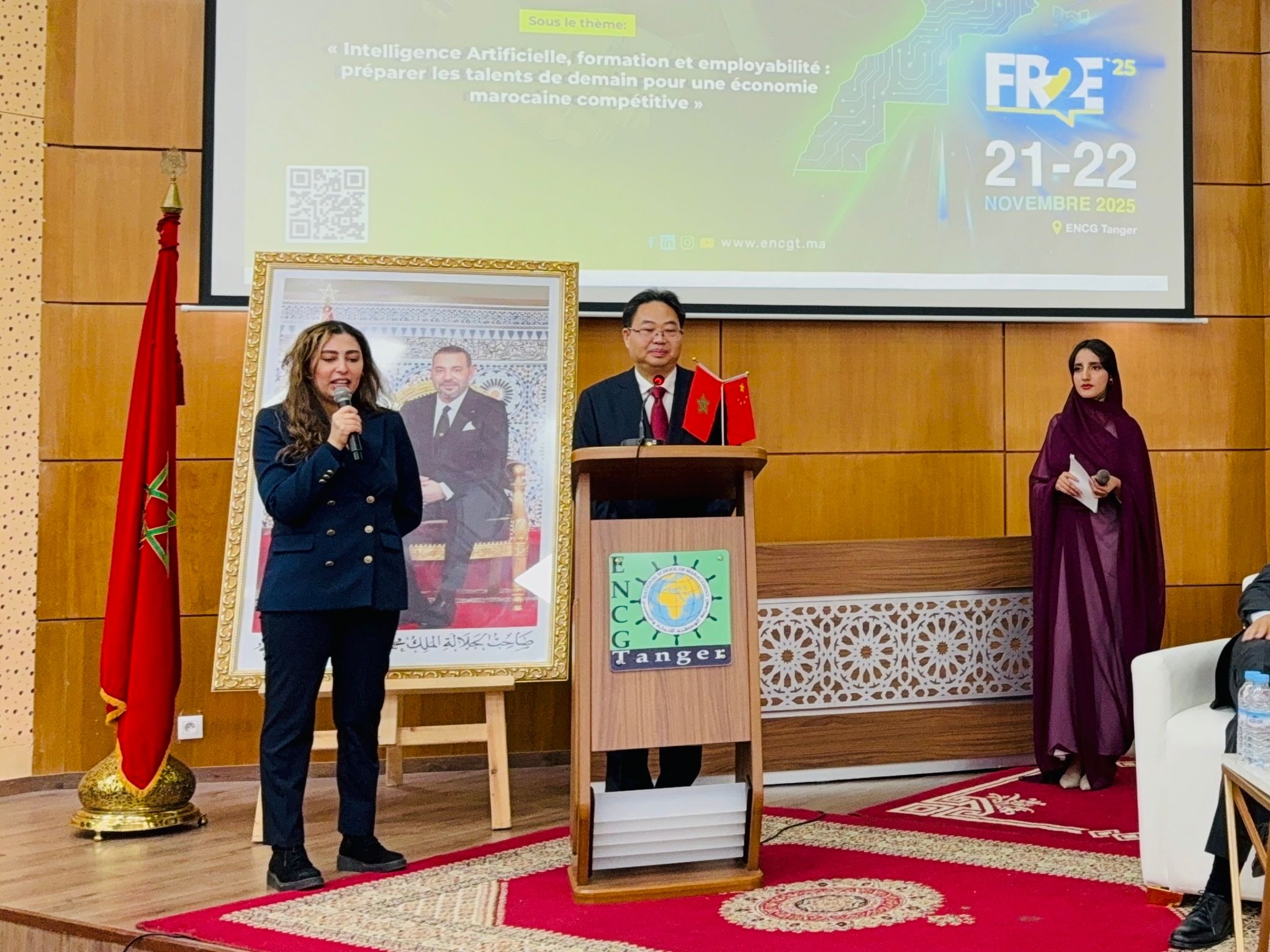 座谈会结束后,出访团受邀出席“得土安-丹吉尔-胡塞马大区校企合作论坛”,袁雄发表了主旨演讲并为企业展台区展示项目剪彩。该论坛由摩洛哥得土安-丹吉尔-胡塞马大区主办,阿卜杜·马立克·阿萨德大学丹吉尔商业与管理学院(ENCGT)承办,丹吉尔市市长、大区商会及企业联合会相关代表、阿卜杜·马立克·阿萨德大学副校长、ENCGT院长、出访团全体成员、孔子学院中外方院长等出席。