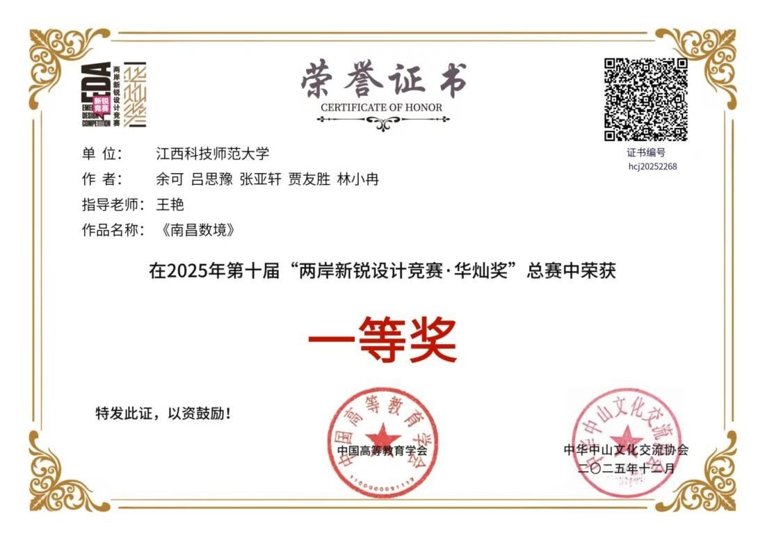 据悉,“两岸新锐设计竞赛・华灿奖是教育部认定的全国大学生学科竞赛国家A类赛事,在海峡两岸暨港澳地区具有广泛影响力,是青年设计师交流展示的重要平台。本届赛事规模再创新高,共征集作品128468件,吸引484496名海内外青年设计师踊跃参赛,竞争尤为激烈。我校师生在此次大赛中荣获佳绩,充分彰显了学校在设计类学科教学中的培养成效。