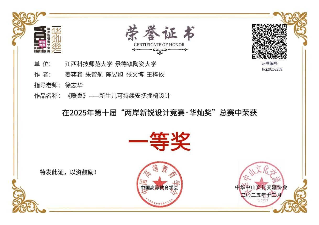 获奖作品《暖巢——新生儿可持续安抚摇椅设计》由徐志华教授指导,姜奕鑫、朱智航、陈昱旭、张文博、王梓依同学共同完成。该作品聚焦婴幼儿产品领域的绿色转型与情感化设计,以“呵护新生、绿色未来”为核心,采用蛋壳仿生造型增强安全感,并全部采用天然竹材与秸秆复合材料,体现可持续发展理念。团队借助AIGC工具高效完成概念图、动态效果展示及宣传物料制作,同时构建“智能监控+远程安抚”系统,在技术辅助下始终关注用户体验与环境和谐。