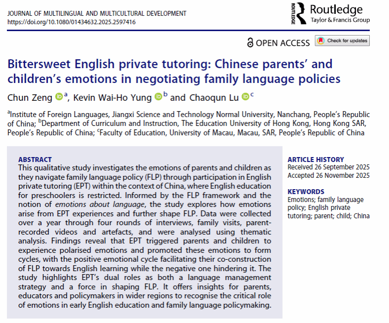 近日,外国语学院曾纯博士(第一作者)联合香港教育大学容煒灝博士(通讯作者)和澳门大学卢超群博士,在语言学领域一区顶尖期刊《Journal of Multilingual and Multicultural Development》(Q1,中国科学院1区,IF:3.9)上发表题为 “Bittersweet English private tutoring: Chinese parents’ and children’s emotions in negotiating family language policies”的研究论文。