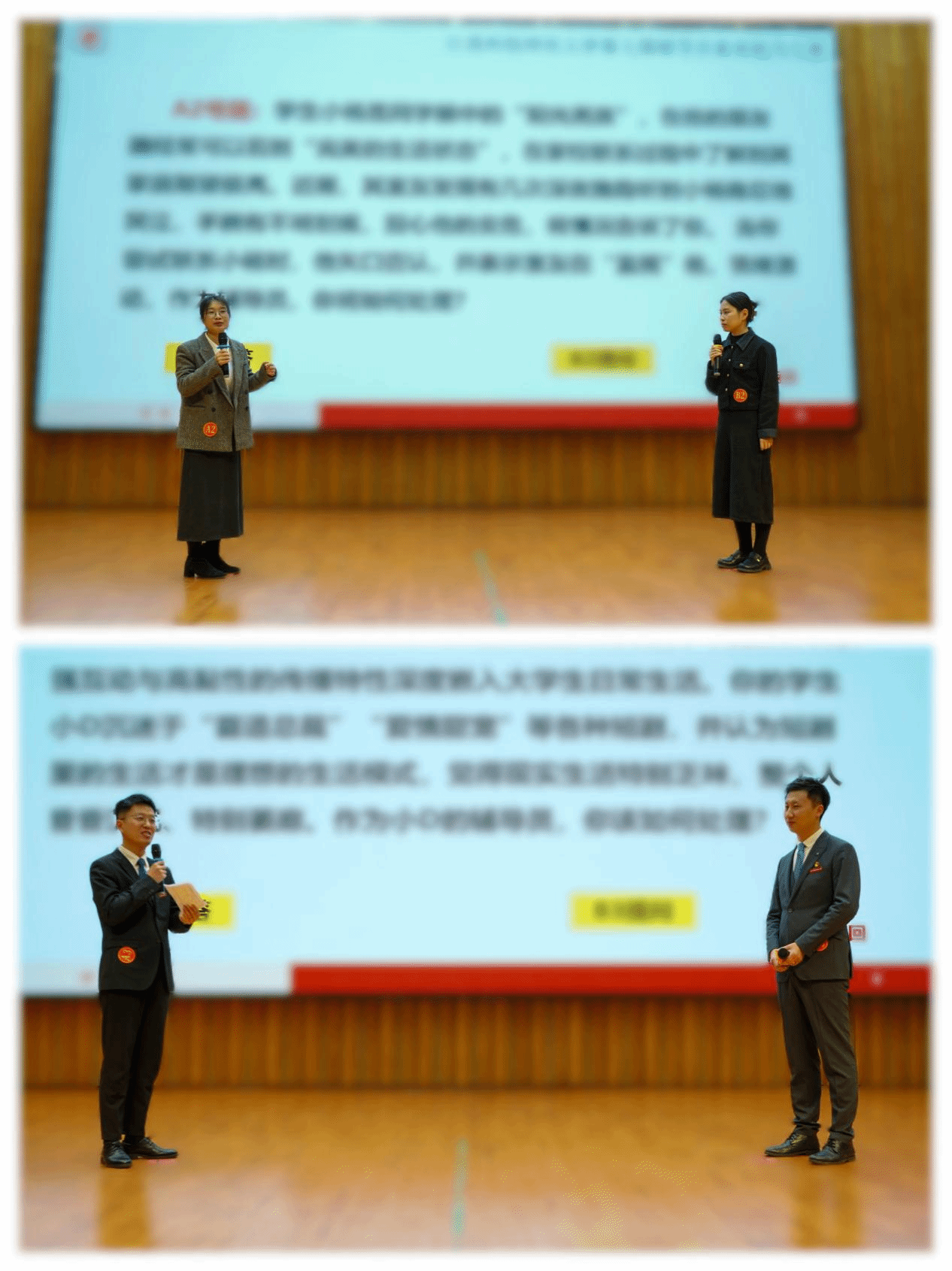 10名表现优异的辅导员晋级决赛。决赛分为“谈心谈话”和“案例研讨”两大环节,精心设计了涵盖思想价值引领、学业指导规划、心理健康教育、职业生涯发展、人际关系处理、网络舆情引导等议题和工作场景。比赛过程中,参赛辅导员紧扣新时代学生工作的重点难点,凭借扎实的理论素养和丰富的一线育人经验,生动展示了选手们精准研判问题症结、科学提出解决方案、有效开展沟通疏导的专业过程,充分展示了我校辅导员队伍的专业厚度与职业温度。