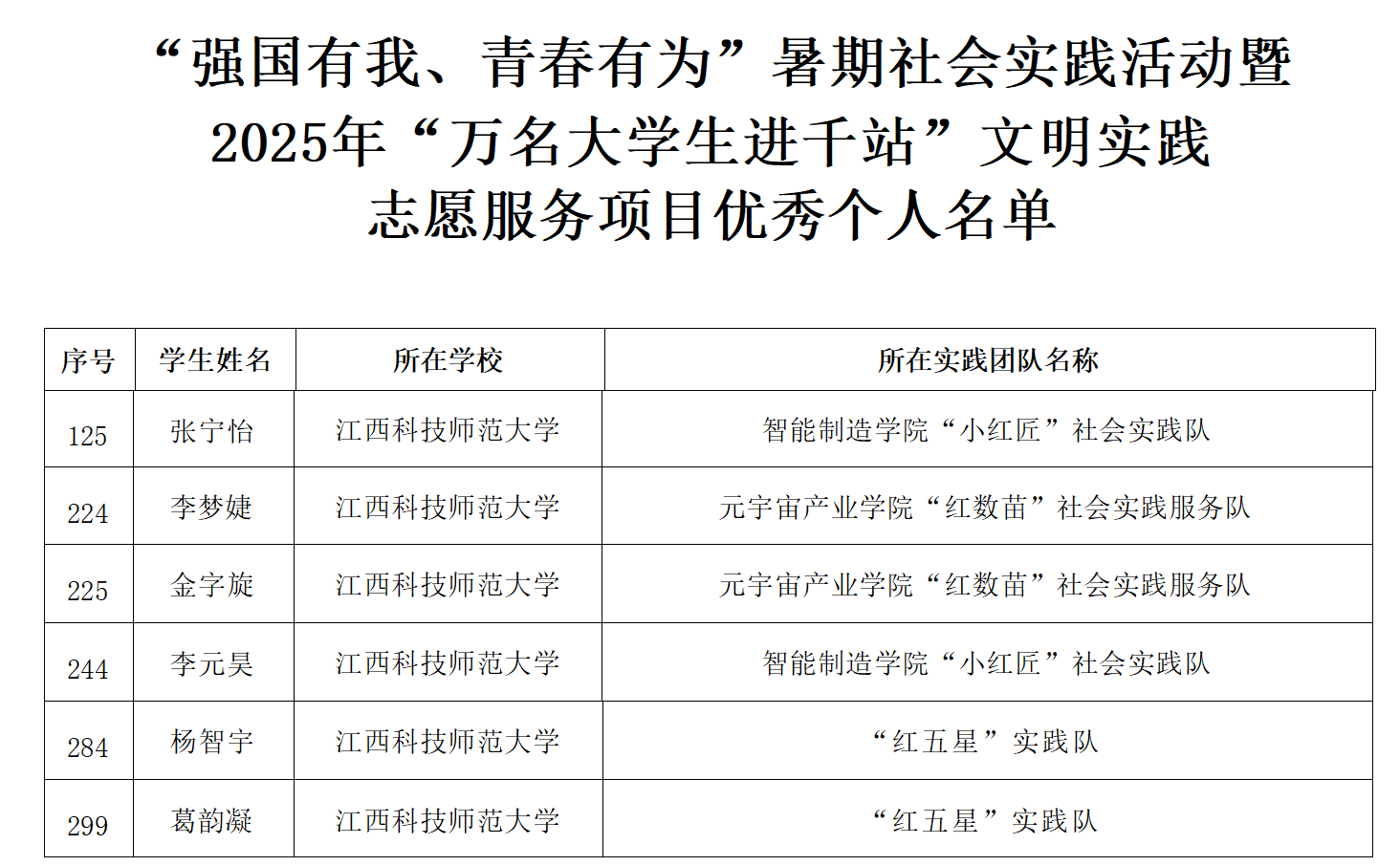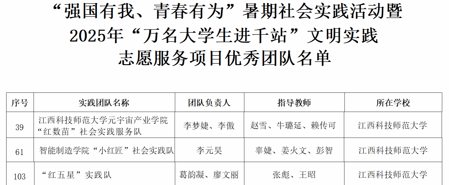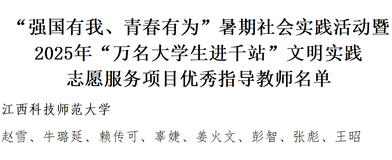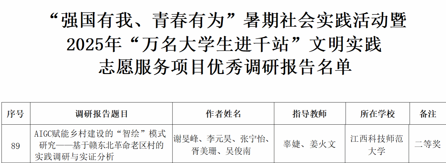 2025年6月至9月,中共江西省委宣传部、江西省文明办、江西省教育厅、共青团江西省委联合开展“强国有我、青春有为”暑期社会实践活动暨2025年“万名大学生进千站”文明实践志愿服务行动。实践活动结束后,经组织推荐、专家评审、公示复核等环节,共评选出优秀调研报告113项、优秀团队159个、优秀个人336人、优秀指导教师446人、优秀组织奖15个、优秀承接单位448个。