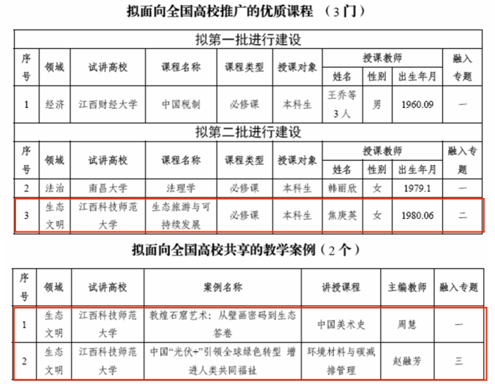 近日,教育部社会科学司印发《关于推进分领域思想专题教学讲义配套教学资源建设的函》(教社科司函〔2026〕1号),公布拟面向全国高校推广共享的优质课程和教学案例名单。在此次分领域思想专题教学讲义配套教学资源建设中,我校喜获佳绩:“生态旅游与可持续发展”课程入选“拟面向全国高校推广的优质课程”(第二批建设);“敦煌石窟艺术:从壁画密码到生态答卷”和“中国‘光伏+’引领全球绿色转型 增进人类共同福祉”两个教学案例入选“拟面向全国高校共享的教学案例”。据悉,此次全省高校共有3门课程入选优质课程,我校占1门;全省共有2个教学案例入选,均为我校报送,展现了我校在推动习近平生态文明思想有机融入专业课程教学方面取得的扎实成效与示范引领性。