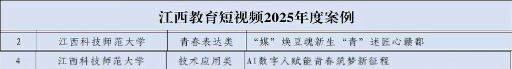 近日,江西省教育厅发布“江西教育融媒体2025年度案例”与“江西教育短视频2025年度案例”。我校报送的4件作品全部入选,在所有入选单位中排名并列第一。此次案例征集涵盖各设区市教育局、赣江新区社会发展局和各高校。我校案例覆盖多个类别,展现了学校在融媒体内容策划、价值引领、青春表达与技术应用等方面的综合实力与创新成效。