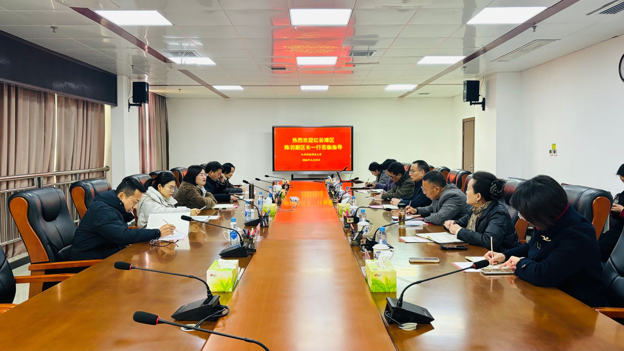 1月23日上午,南昌市红谷滩区政府副区长陈羽率队来学校幼儿园开展托育工作专题调研。区政府办公室、区卫健委等单位负责人随行。副校长裘指挥出席调研座谈会。
