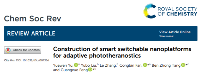 近日,我校化学化工学院范丛斌教授团队俞岳文博士在智能光诊疗材料及肿瘤诊疗研究领域取得突破。相关成果以题为“Construction of smart switchable nanoplatforms for adaptive phototherapeutics”发表于国际顶级综述期刊《Chemical Society Review》(中国科学院I区top期刊,IF = 39.3)。这是我校化学化工学院首次以第一通讯作者单位在该期刊上发表学术论文。