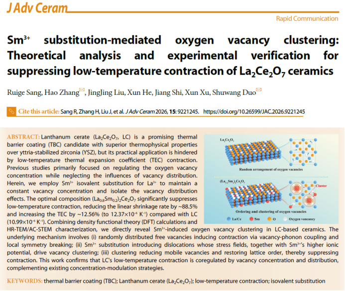 近日,我校材料与能源学院/材料表面工程江西省重点实验室多树旺教授课题组在热障涂层材料研究领域取得重要进展。相关成果以题为“Sm3+ substitution-mediated oxygen vacancy clustering: Theoretical analysis and experimental verification for suppressing low-temperature contraction of La2Ce2O7 ceramics”发表在《Journal of Advanced Ceramics》(中国科学院I区top期刊,IF = 16.6)。该研究通过Sm3+同价掺杂策略,将La2Ce2O7陶瓷的低温收缩率降低88.5%,为下一代航空发动机与燃气轮机热障涂层的设计与应用提供了全新思路。