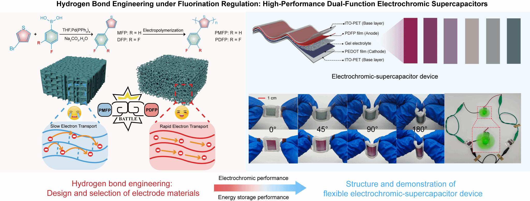 近日,校柔性电子创新研究院、柔性电子江西省重点实验室张革副教授、黄瑶博士团队,在《Chemical Engineering Journal》上发表题为“Hydrogen bond engineering for dual-function integration: Fluorinated phenylthiophene for electrochromic supercapacitors”的最新研究成果。