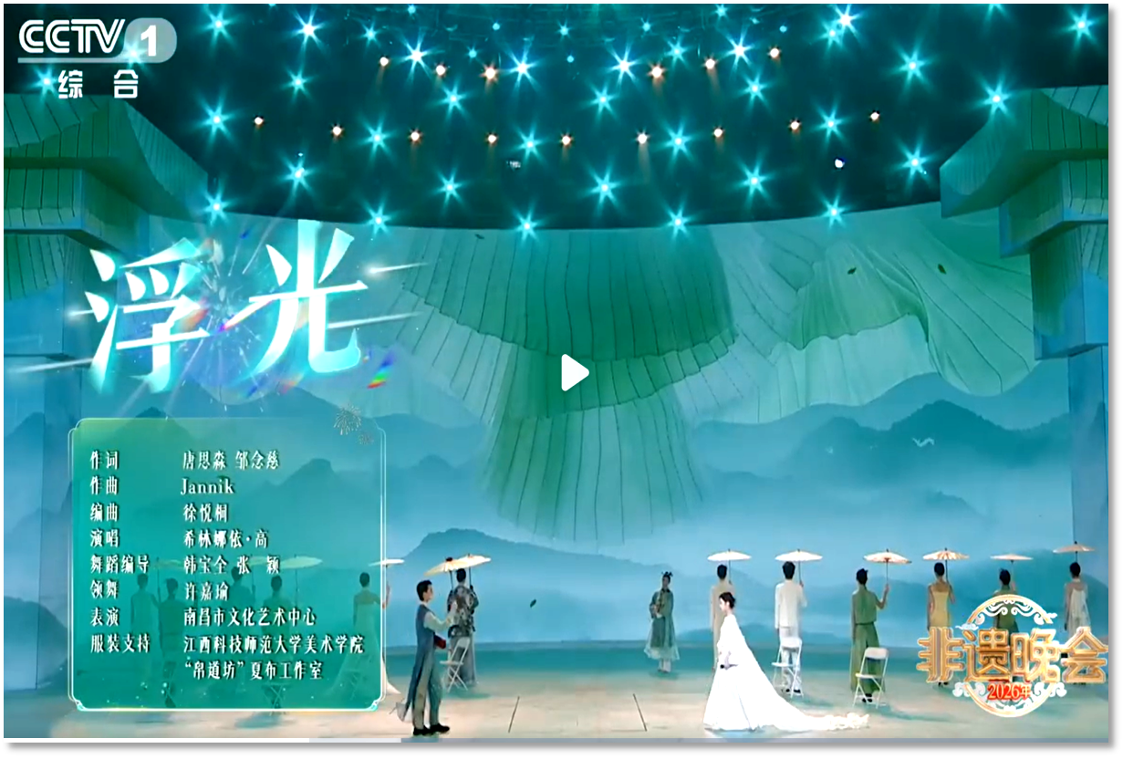 经导演组严格遴选,该工作室为歌曲《浮光》量身打造的系列夏布服装被确定为演出服装。该节目由知名歌手希林娜依·高、夏布织造技艺传承人及专业演员联袂演绎。在央视综合频道(CCTV-1)的舞台上,这些融合了传统夏布工艺与现代时尚设计的服饰,生动呈现了江西非遗的独特魅力。
