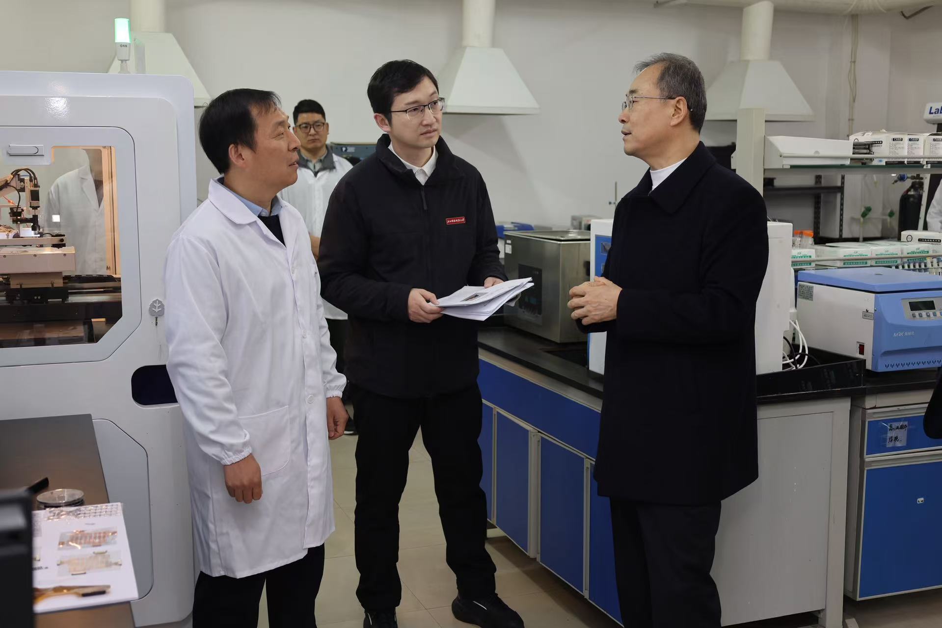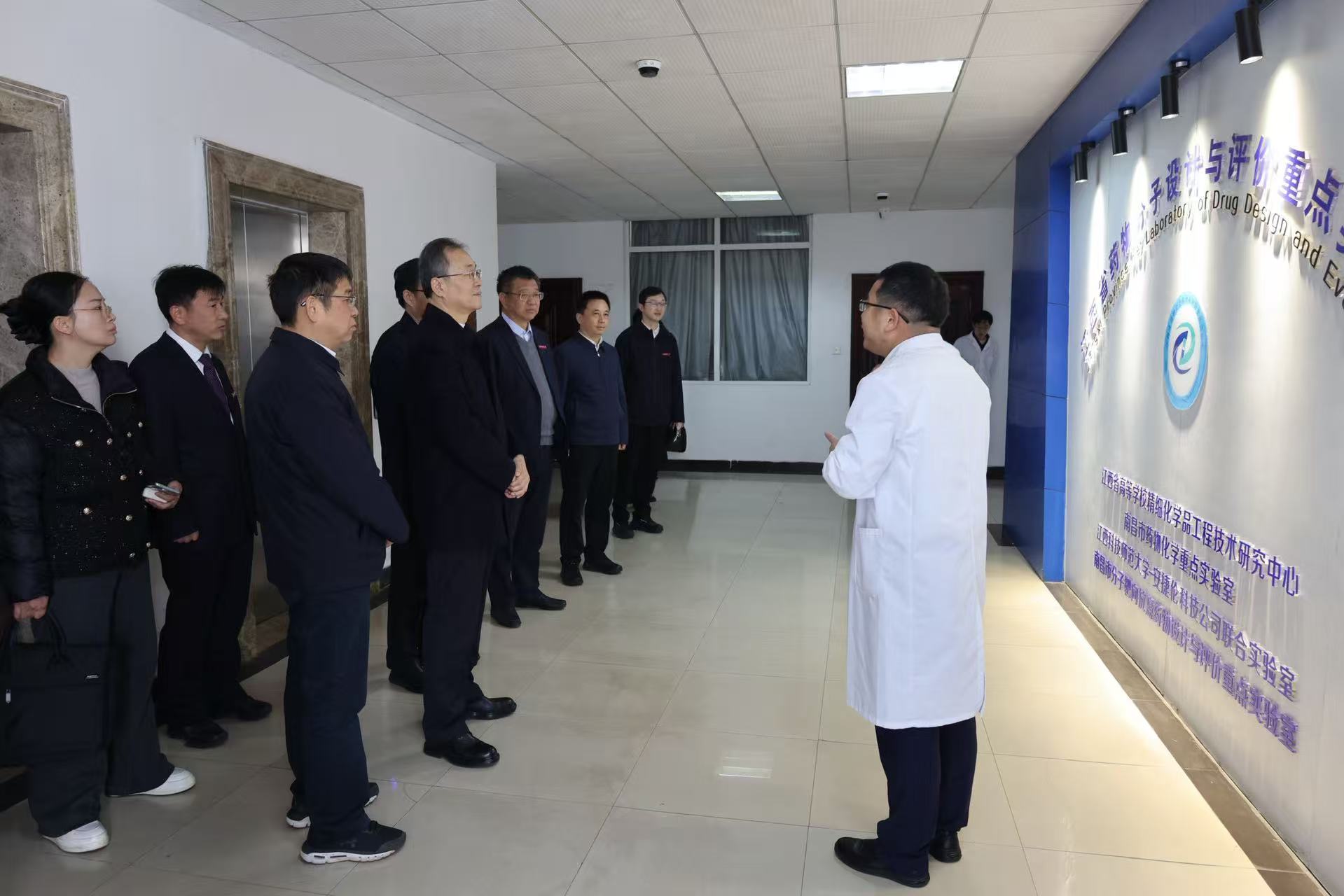在枫林校区第一实验楼,孙洪山听取了学校化学学科建设情况汇报。他对该学科以有机磷与核酸化学、智能涂层材料等为特色,有力支撑我省“1269”行动计划,并进入全球ESI前5‰表示肯定。他指出,学科建设要紧密对接国家战略和江西产业发展需求,希望学校继续发挥学科优势,加强高水平科研平台和人才团队建设,产出更多标志性成果,为江西重点产业链升级提供更强科技支撑。在有机功能分子江西省重点实验室,孙洪山详细了解了实验室作为从清华大学引进人才团队服务江西发展的历程,赞扬了实验室在基础研究与应用转化方面取得的丰硕成果,勉励实验室继续发挥示范引领作用,深化产学研协同,将更多科研成果转化为现实生产力。在药学院及药物分子设计与评价江西省重点实验室,孙洪山对学院在应用型药学人才培养、深化校企合作方面的创新实践以及实验室在创新药物研发、特别是在放射性药物特色方向的建设成效给予肯定,要求学校继续探索产教融合新模式,培养更多高素质应用型人才,助力我省生物医药产业高质量发展。在学校分析测试中心,孙洪山考察了2023年新成立、拥有近亿元先进设备的中心建设情况,希望学校管好用好先进设备,将其打造成服务本校科研、辐射区域产业创新的高水平公共平台。