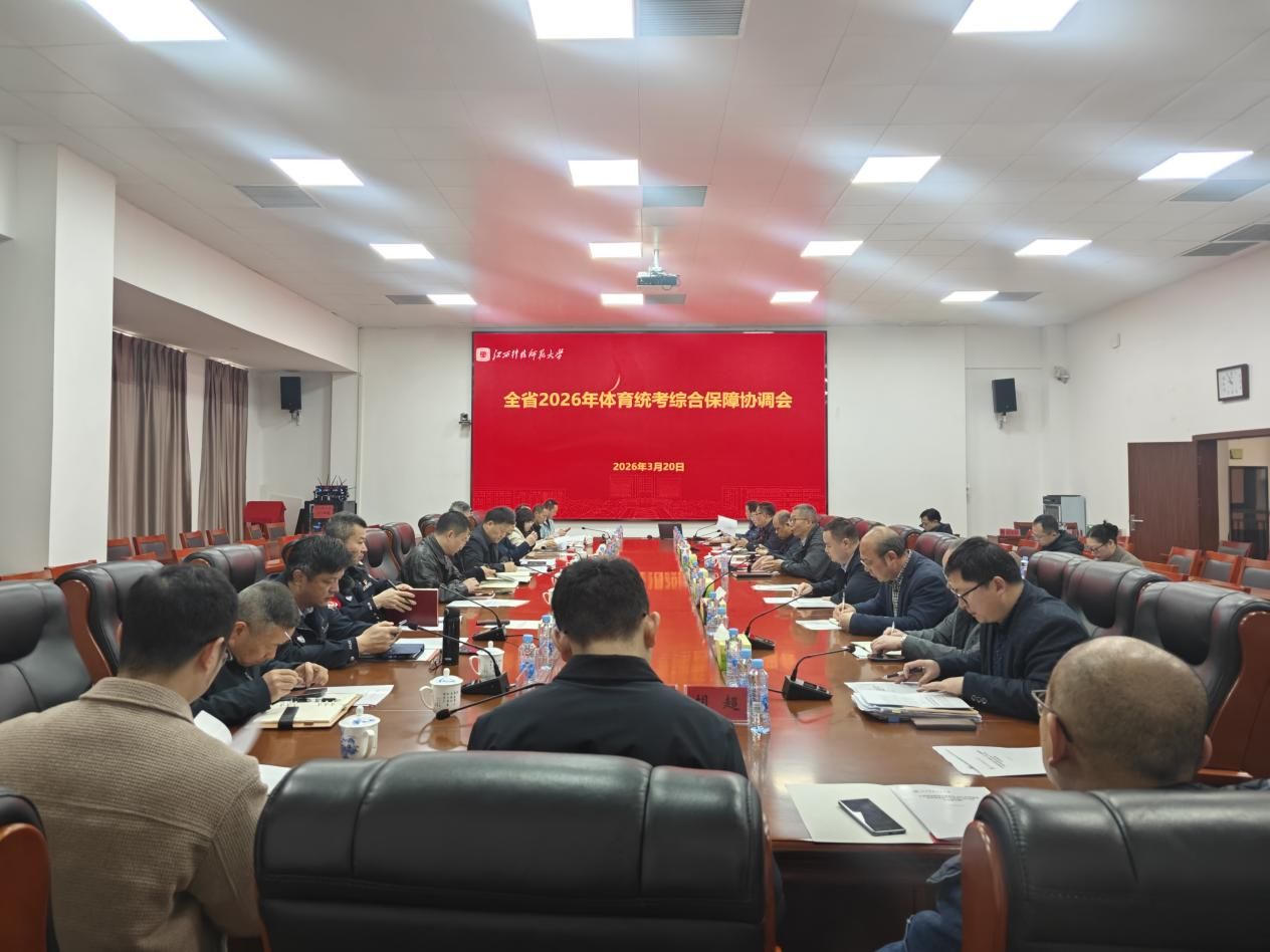 3月20日,江西省 2026 年体育统考综合保障协调会在我校红角洲校区图书馆第三会议室召开。会议由我校副校长郑鹏武主持。江西省教育考试院党委书记刘彪文、副院长黄建及相关处室负责人,红谷滩区政府教育、卫健、公安、交警、市场监管等各职能部门相关负责同志及学校相关职能部门负责人出席。