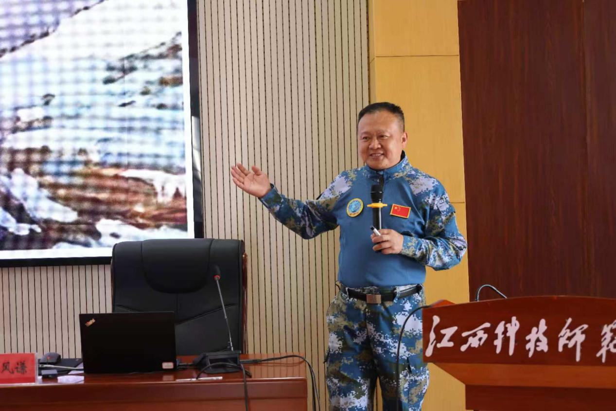 4月19日,江西省国防教育研究院、江西科技师范大学在红角洲校区图书馆学术报告厅举行“旗帜·先锋的力量”国防教育专题报告会。逐梦深蓝讲师团发起人、海军石家庄舰原政委林风谦应邀主讲。