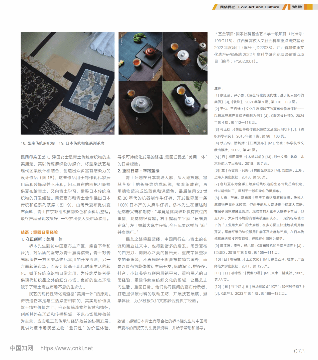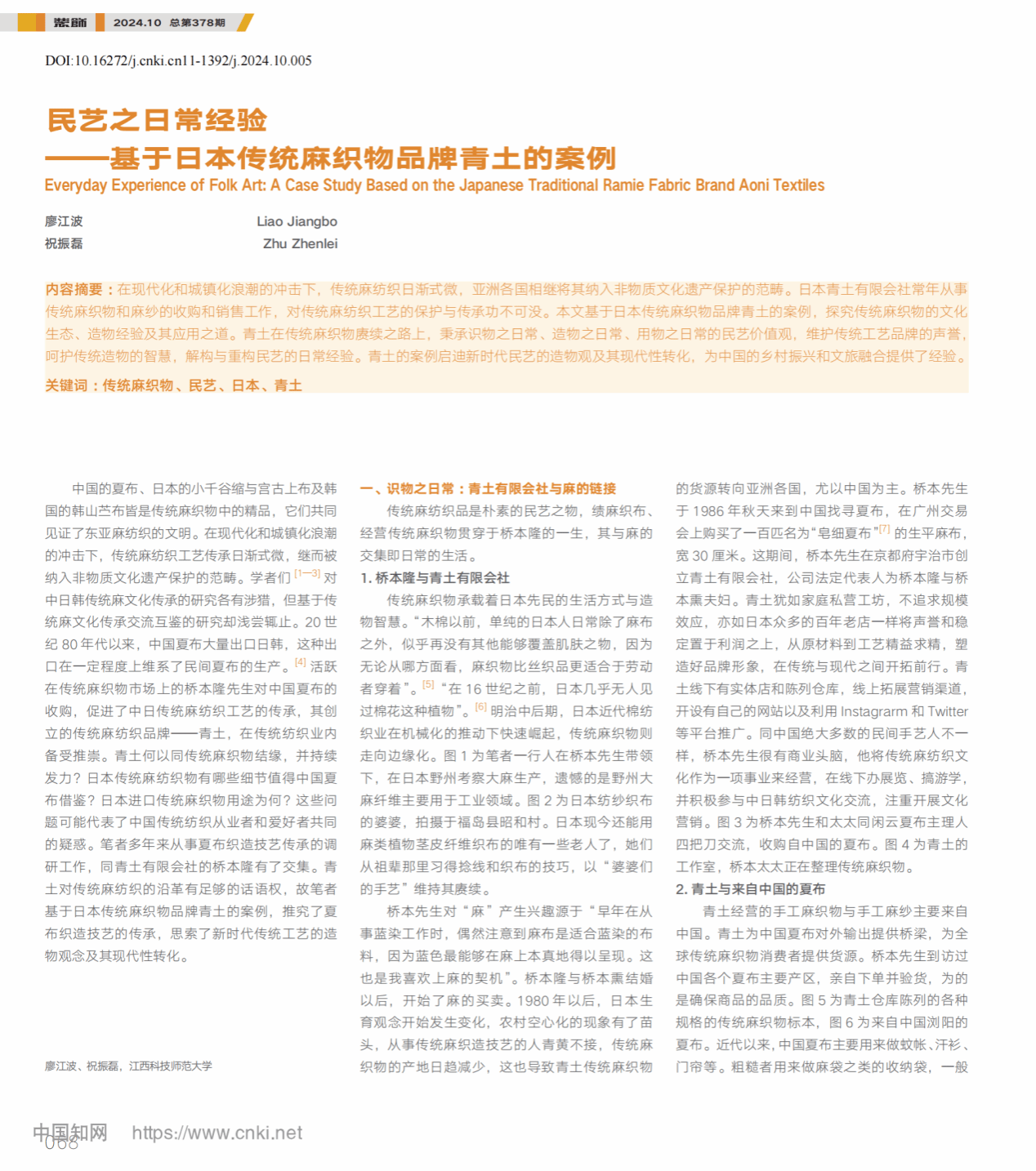 近日,美术学院廖江波教授团队在CSSCI来源期刊《装饰》发表题为“民艺之日常经验:基于日本传统麻纺织品牌青土的案例”的学术论文。